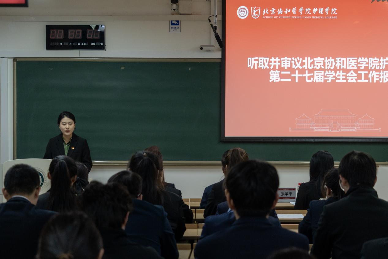 第二十七届学生会主席曲泉颖向大会作《厚植医学情怀,砥砺初心使命,承载历史荣光,肩负时代责任,为推进健康中国建设贡献青春、智慧和力量》工作报告,回顾总结第二十七届学生会工作,对新一届学生会工作提出思考与建议。