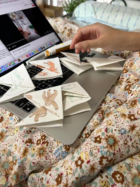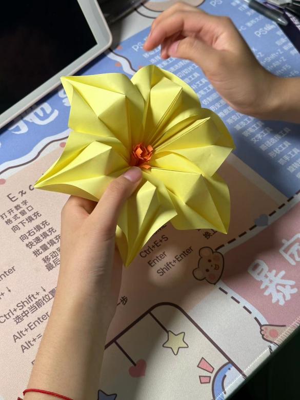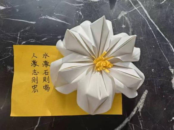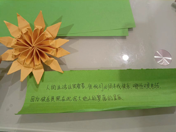 此外,同学们还在文段的结尾送上勉励话语或哲理名言,寥寥数语中寄托出对孩子们茁壮成长的美好希冀,期盼未来能够拥有“欲穷千里目,更上一层楼”的远大抱负, “非淡泊无以明志,非宁静无以致远”的超然旷达。最后,将这些承载爱与关怀火种的彩纸用心折叠、细致剪裁,精雕细琢后浇灌出一朵朵明艳阳光的花朵。