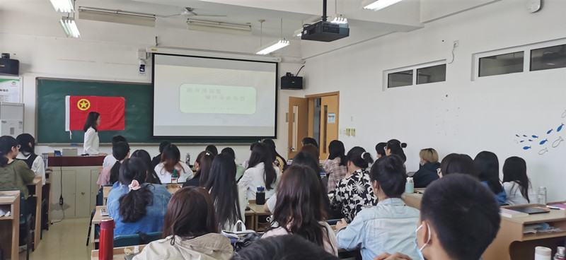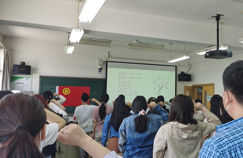党史学习教育的最后一部分是重温入团誓词环节,跟随激昂的团歌,全体共青团员庄严肃立,再次响亮的念出入团誓言。嘹亮恢弘的声音盘旋在教学楼中,回荡着的是同学们对中国共产党和对中国共青团的尊敬和热爱!