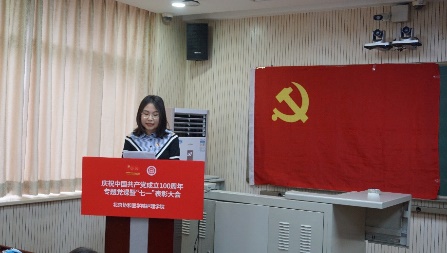 颁奖结束后,教职工党支部王欢同志,优秀共产党员代表刘迪同志和优秀党务工作者张京煜同志分享各自学习习近平总书记在庆祝中国共产党成立100周年大会上的重要讲话精神、对党的赤诚情怀和无限热爱、学习型党组织建设等方面的体会和感悟,表达了听党话、感党恩、跟党走,坚定理想信念、永葆初心使命的信心和决心。