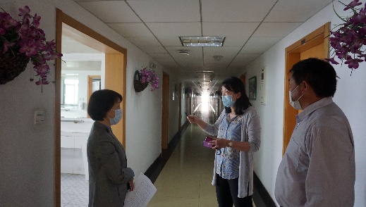 督导组一行首先听取了李峥院长关于学院2020年返校复学准备工作的汇报,详细询问并了解了入学报到流程、防疫物资储备、师生进校流程、教室布置、用餐管理、住宿安排和环境消杀等各项工作的具体情况;随后在王欢副院长陪同下先后对校门口测温区、教室、食堂、学生公寓等多个防控关键地点进行了实地查看。