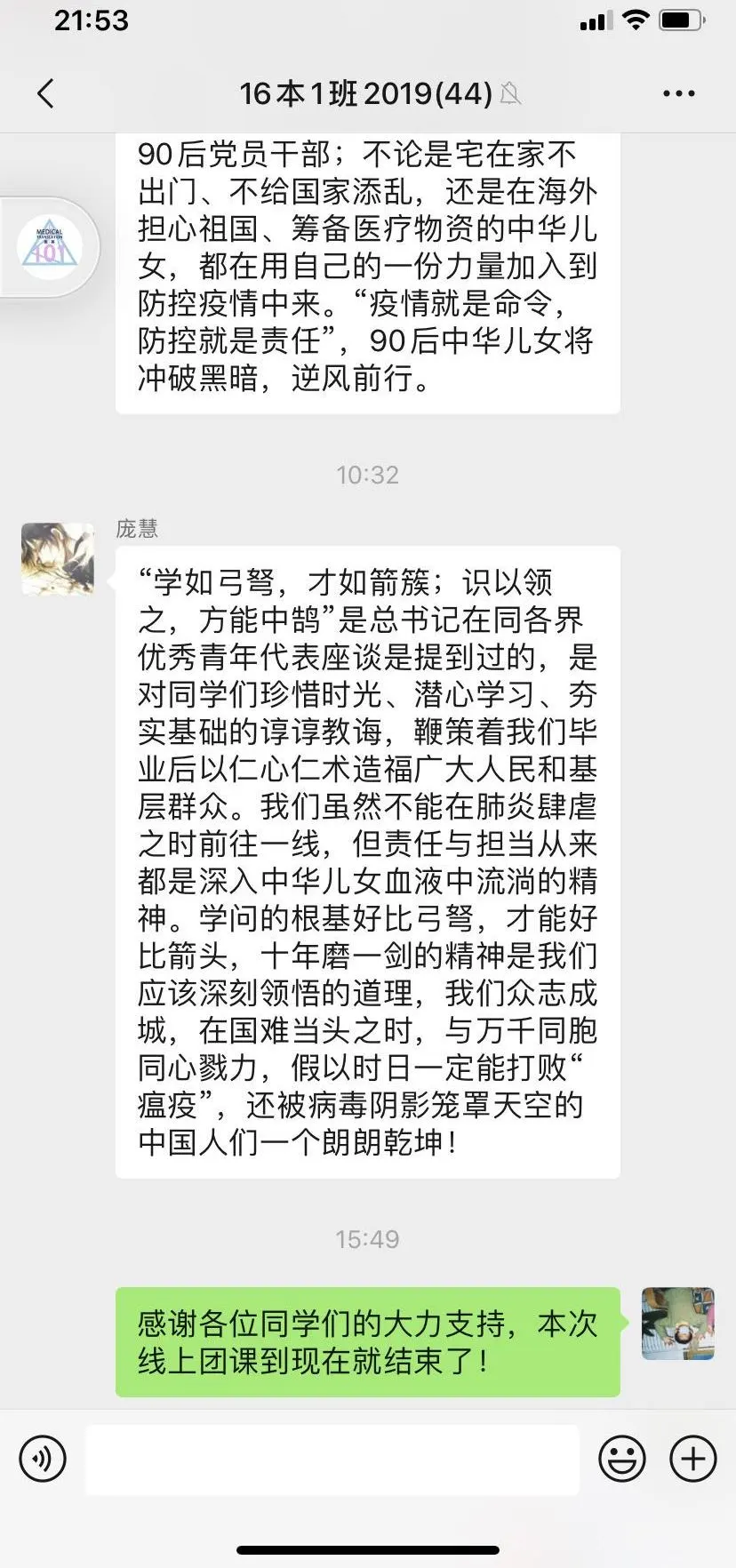 此次团支部活动不仅是团干部在特殊时期发挥职责作用的展现与落实,更是及时为团支部思想与行动的继续砥砺前行提供了动力,同时也使我们重新认识与思考以天下为己任的医学生素养情怀,以及警诫提醒我们特殊时期不要因为突发情况阻碍了专业学习的步伐与进程。