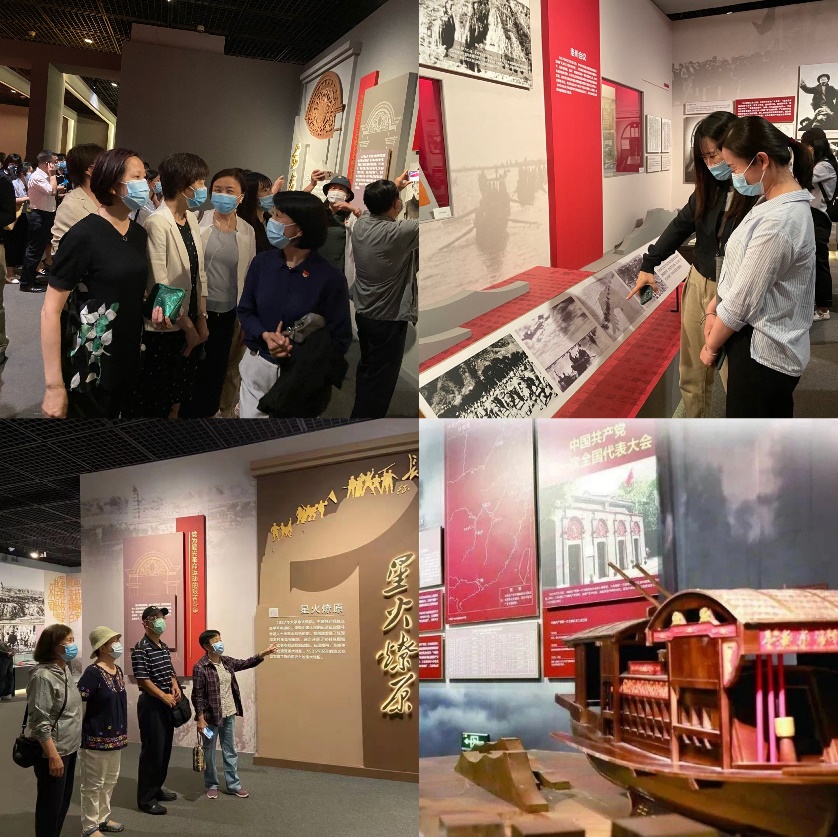 走进展厅,“十月革命一声炮响,给我们送来了马克思列宁主义”的耀眼大字,顿时扑入我们眼帘。循着具有标志意义的数字立柱前行,可清晰和全面地了解中国共产党在风雨飘摇的时代,走过了一段艰辛而漫长的路。大家按照建党的时间轴线依次参观了“东方破晓”、“星火燎原”、“中流砥柱”、“夺取胜利”四个主题单元。通过观看中共一大会址嘉兴南湖红船模型、《共产党序言》译本、八七会议记录和开国大典上的礼炮等实物模型和实物展品,阅读陈独秀、李大钊等革命先烈的主要事迹,回顾了中国共产党诞生到新中国成立的伟大历程,波澜壮阔的历史画卷在面前徐徐展开。部分同志结合最近观看的建党百年献礼电视剧—《觉醒年代》,不断交流心得体会,深化理解党史知识。