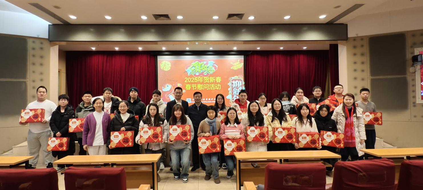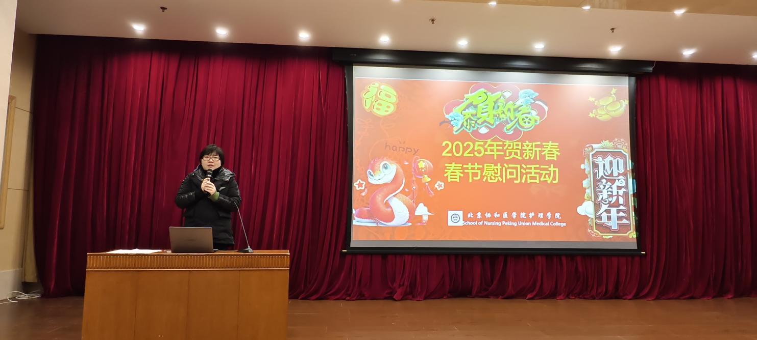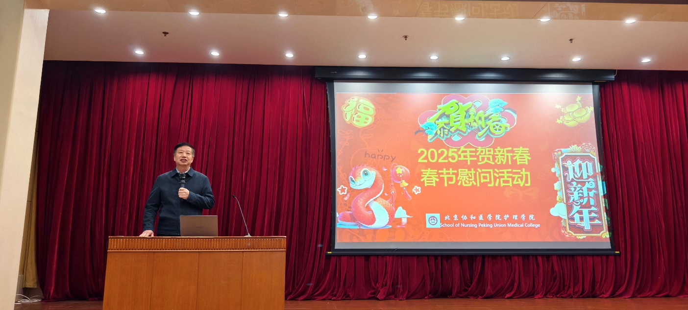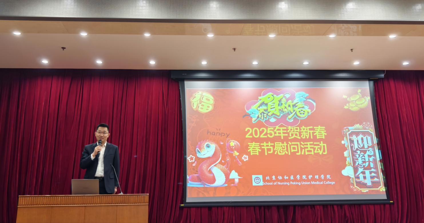 旧岁已展千重锦,新年更进百尺竿。学院党委书记安道彩带领大家回首甲辰龙年,学院以“立德树人”为己任,砥砺奋进、开拓创新,取得丰硕成果。展望未来,乙巳蛇年适逢协和高等护理教育105周年暨恢复高等护理教育40周年,希望同学们在最后的大学生活中,仍然保持初心、追寻梦想、勤奋学、努力工作、练就专业本领,创造属于自己的辉煌,为自己精彩人生不懈奋斗。在喜庆祥和的气氛中,崔庚申处长和安道彩书记向同学们送上慰问品,祝愿同学们在学校度过一个快乐、平安、幸福、祥和的新春佳节。