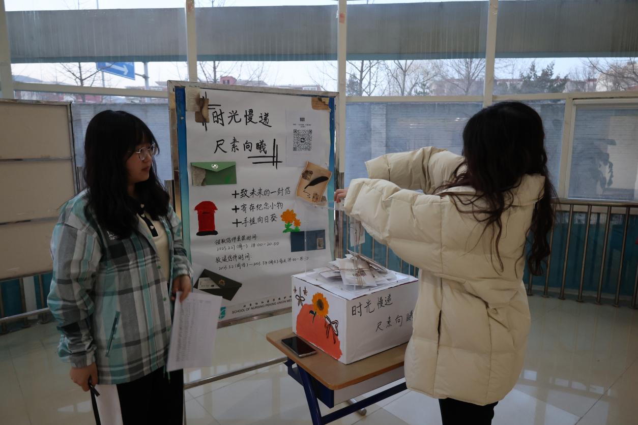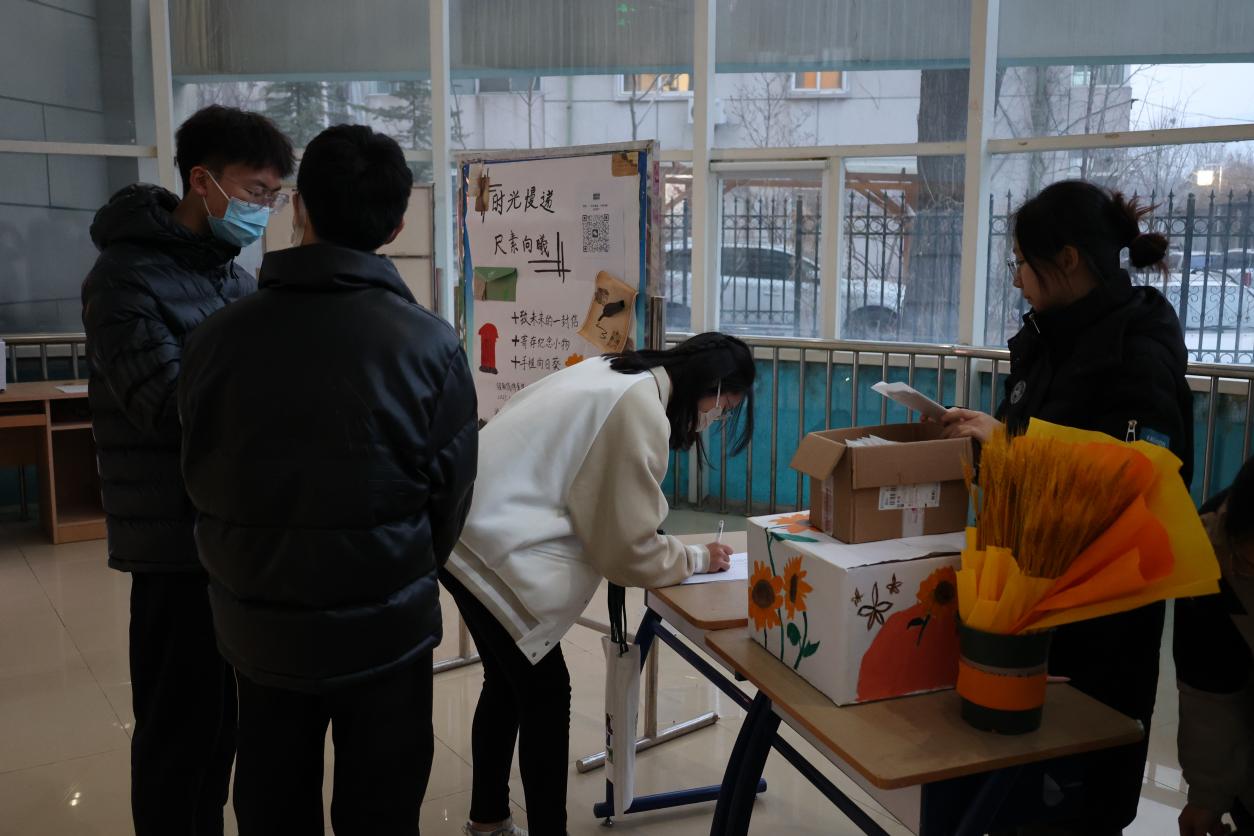 本次活动共分为寄存一些值得纪念的小物件、致未来的一封信和种下对未来的希冀三个部分。活动开始时,许多同学前来宿舍楼一层圆弧领取此次活动的用品,并且认真了解活动的注意事项。活动期间,同学们把写满文字的信纸或者曾经最有意义的小物件装入信封并按照自己喜欢的样子装饰好,写上宿舍号和班级姓名,郑重地将它们投入事先准备好的亚克力箱子里,完成一次属于自己的“时光慢递”。除此以外,还有一部分同学选择领取了自己的向日葵种子,相信向日葵种子正带着同学们的希望蓬勃生长。