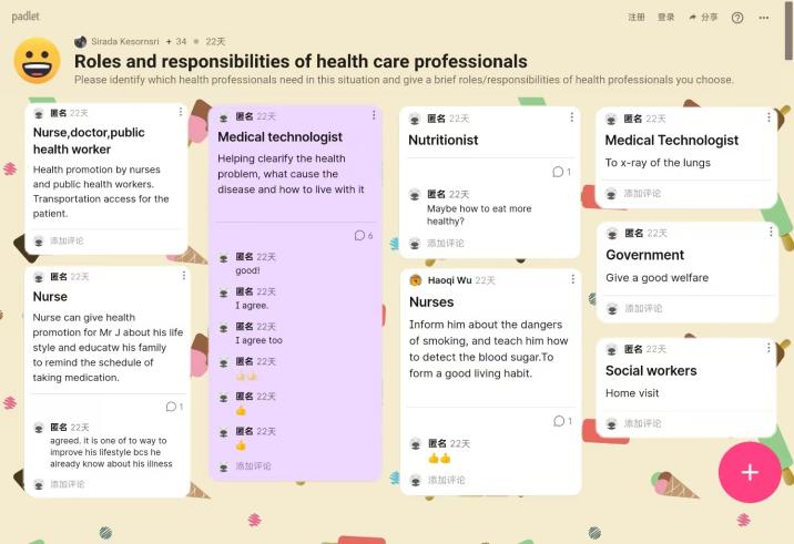最后,老师提出了关于当下所需的健康保健专业的问题,让大家结合所学在padlet平台上分享自己的观点,相互交流。