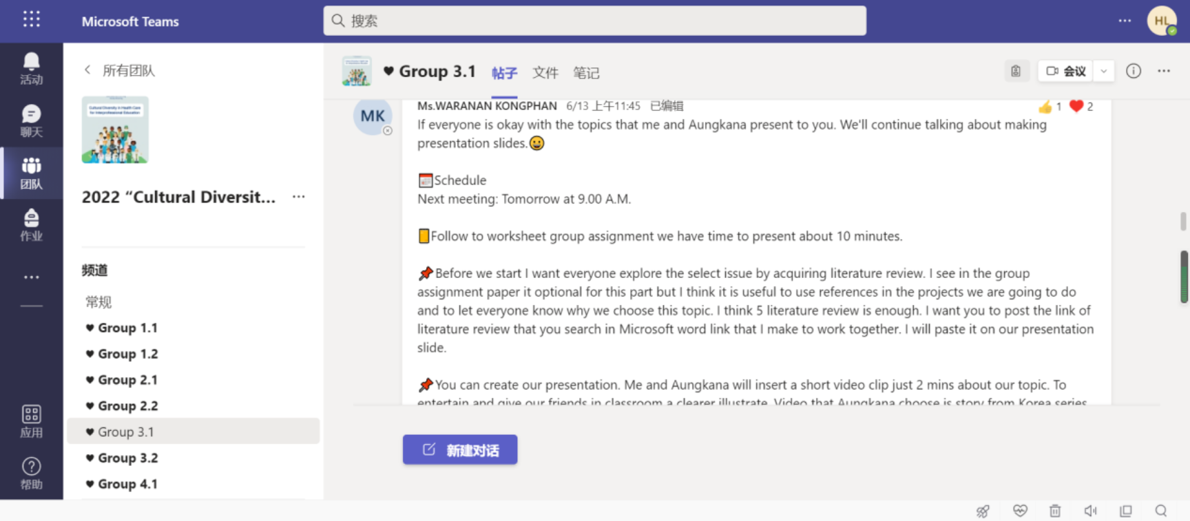 本次交流活动分成了十个小组,每两个小组为一个大组,每个小组由7-8名来自亚洲各个不同国家的同学组成。虽然小组成员来自不同的地区,说着不同的语言,但是每个人都积极参与到了小组合作学习中,面对陌生的语言环境没有人感到怯场,每个人都很热情。同学们用Microsoft team/LINE/Instagram/WeChat等社交软件进行交流沟通。