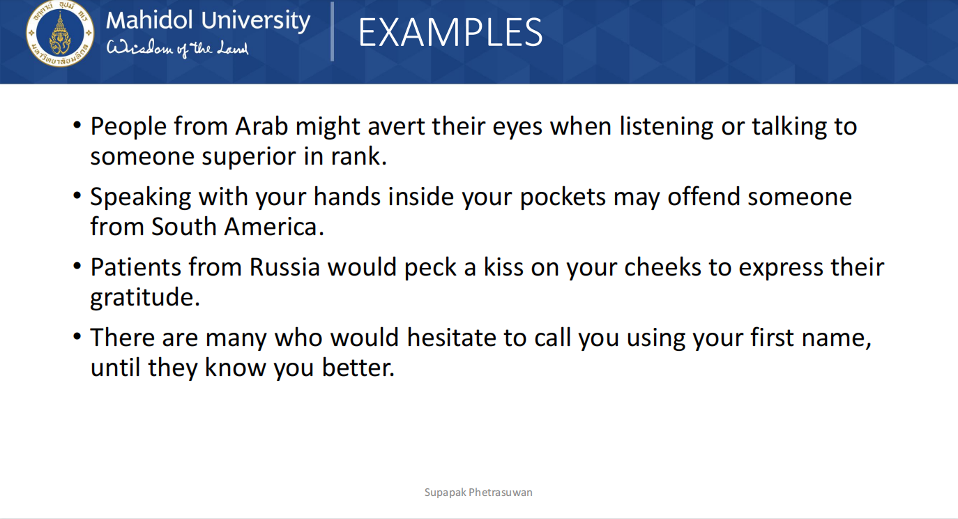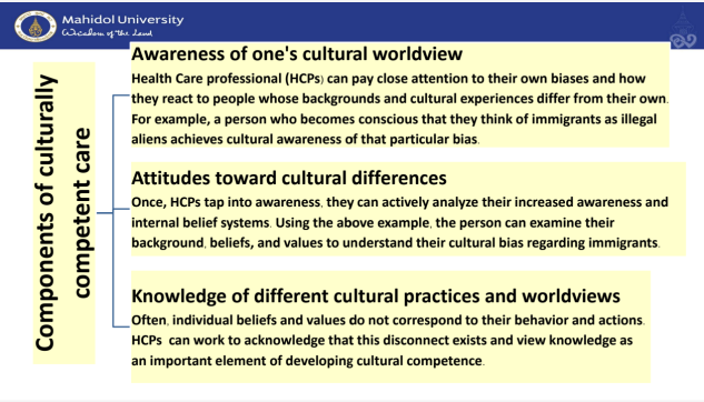 另外Dr. Supapak的一节课是关于Cultural awareness and cultural sensitivity(文化意识和文化敏感性),就是强调医务工作者需要客观地看待来自不同风俗地方的不同患者,尊重他们的文化,并尽可能提高自己的跨文化交流和医疗水平为患者提供更舒适的医疗条件。课上老师提到了一些案例,比如在部分地区可能并不接受有创的操作而因此拒绝最佳医疗方案。