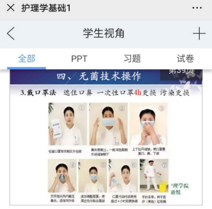 《护理学基础》是护理专业的核心课程,衔接基础医学与临床护理学,讲授护理基本概念、基本知识和护理技能,培养学生识别、发现和分析解决问题的能力。主要的特点是授课内容强调理论与实践相结合,重视护理学科的实践性和对学生临床问题识别能力的培养,教学大纲对课堂讲授与示教室学习课时比例的要求为1:1。然而,以师生时空分离为特点的线上教学无法实现学生现场跟随示教老师做练习,如何最大限度地完成原来的线下示教授课内容就成为目前该门课程教学中的主要问题。