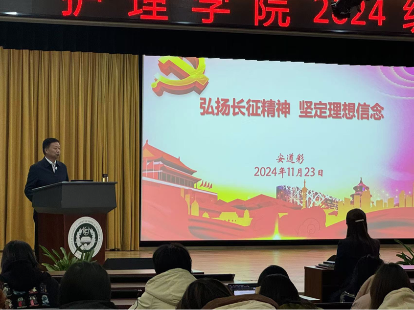安道彩书记带领同学们穿越历史迷雾,探寻长征精神源头。第五次反围剿败北,红军被迫战略转移,民族危在旦夕,在此绝境,长征精神磅礴而生。将家国大义置顶,理想信念如磐,坚信正义必临;无畏艰难,愿付一切护国安民;独立自主、实事求是,扎根现实觅生机;顾全大局、严守纪律、紧密团结,聚磅礴之力;依靠人民、生死与共、不懈奋斗,固胜利之本。协和学子,当牢记使命,追红色足迹,练强本领,承先辈志,为健康中国建设添砖加瓦。