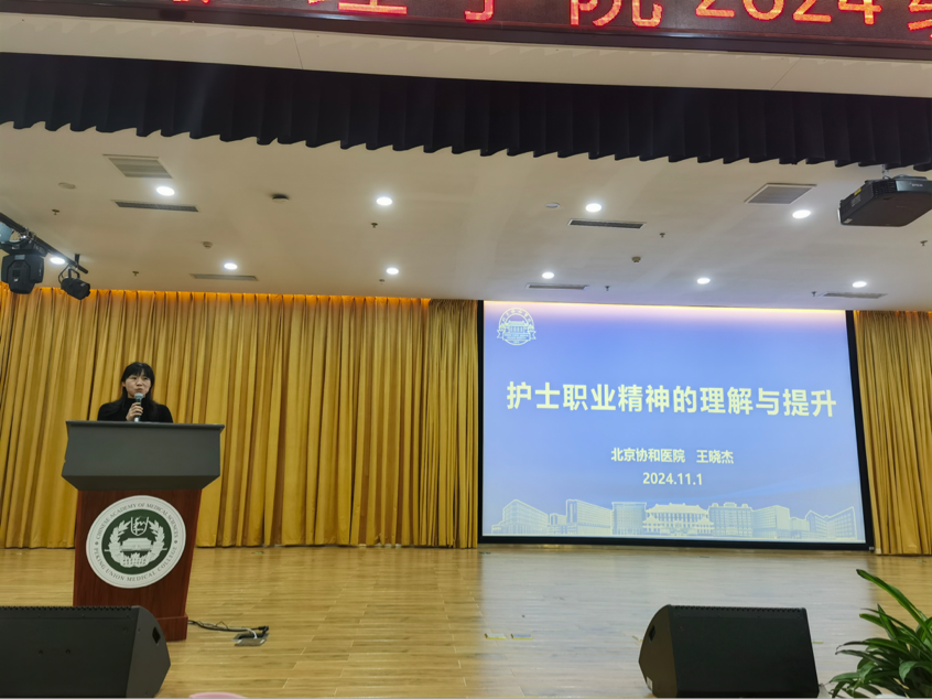 王晓杰护士长从自己的临床经历出发,为同学们深入解读了护理职业精神的内涵。护理职业精神的核心要素包括提高护理质量、促进医患关系和谐、增强自我价值。主要体现于关爱患者尊重生命、专业技能与团队合作等方面,要拥有无私奉献、高尚道德、坚韧不拔的道德品质与强大的心理素质。同时,她还介绍了北京协和医院VTE专科护理团队的专业价值与发展前景,团队通过开展线下门诊、线上诊疗和咨询、科研创新等方式引领和推动我国VTE专科护理发展情况。