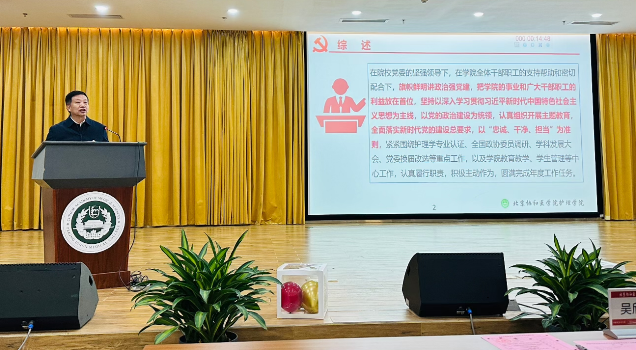 学院领导班子成员围绕“德能勤绩廉”五方面作个人述职,就履职情况、存在不足以及未来打算进行报告。