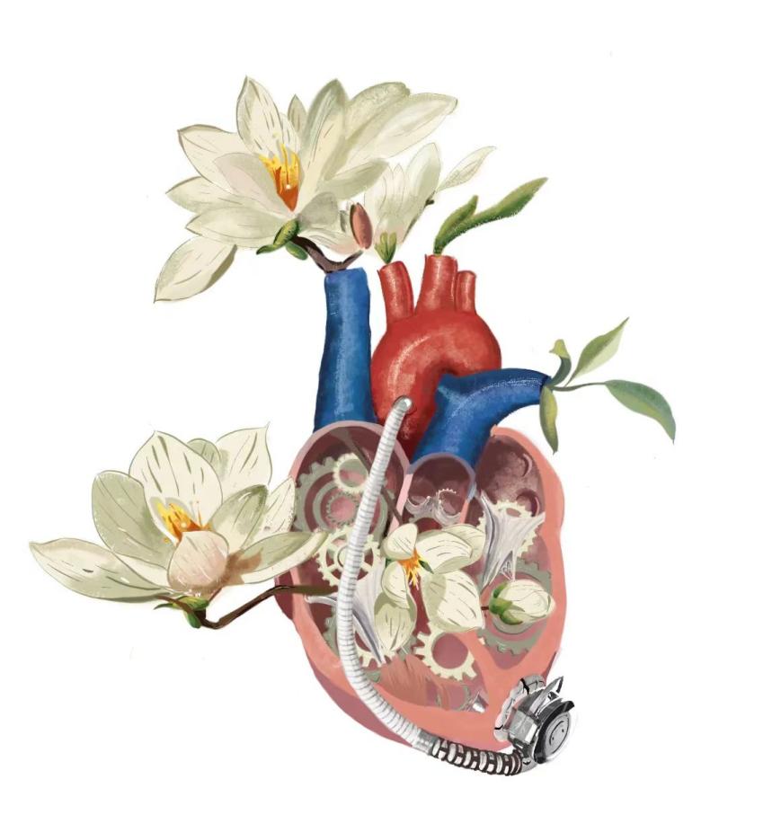 作品《春日迟迟,心木萋萋》的灵感主要来源于张宇炀同学在心外科见习时遇到的一位LAVD置入术后患者。图中被剖开的心脏在解剖结构基础上融入了左心辅助装置,齿轮精准运转,代表着现代医学的尖端科技使得生命的种子生根发芽。“藉今之医道,吾复得生之权焉”,心脏深处开出的玉兰花正是生命的奇迹,更是对现代医学技术的高昂赞歌。